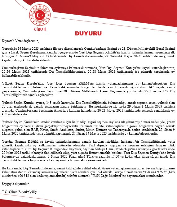 Yüksek Seçim Kurulu'nun sandık kurulması için belirlediği asgari seçmen sayısına ulaşılamamış olması nedeniyle, görev bölgemizde oy verme işlemi gerçekleştirilmeyecektir. Bununla birlikte, vatandaşlarımız görev bölgemize coğrafi olarak nispeten yakın olan BAE, Katar, Suudi Arabistan, Sudan, Mısır, Umman ve Tanzanya'da açılan sandıklarda 27 Nisan-9 Mayıs 2023 tarihlerinde veya gümrük kapılarında 27 Nisan-14 Mayıs 2023 tarihlerinde oy kullanabileceklerdir.